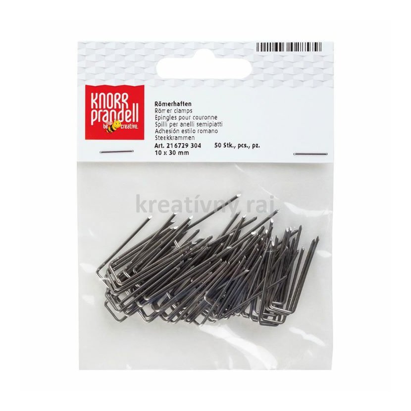 aranžérske spony sú nenahraditeľným pomocníkom amatérskych aranžérov kvetov, ako aj profesionálnych floristov • sú kovové a majú tvar písmena U a dva ostré konce, aby sa ľahko zacvakli do venca a pevne držali dekoračný materiál • používajú sa na prichytávanie vetvičiek, machu, stúh, kvetov a iných dekoratívnych prvkov • rozmery: 1 x 3 cm • balenie: 50 ks