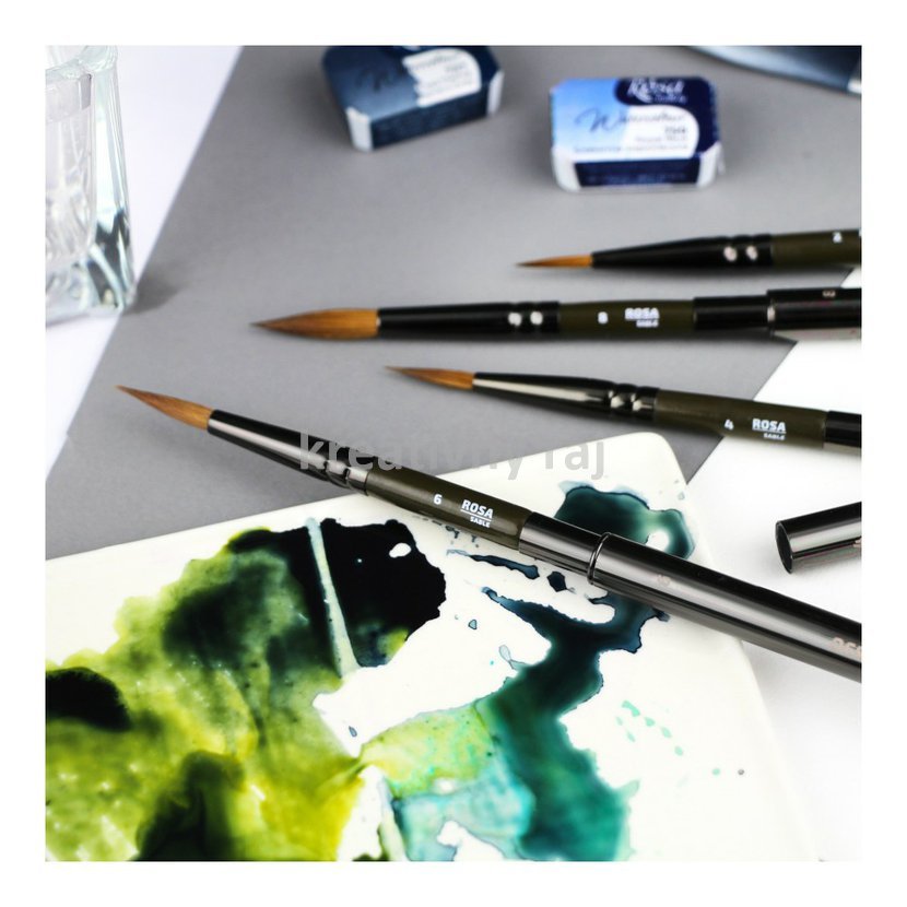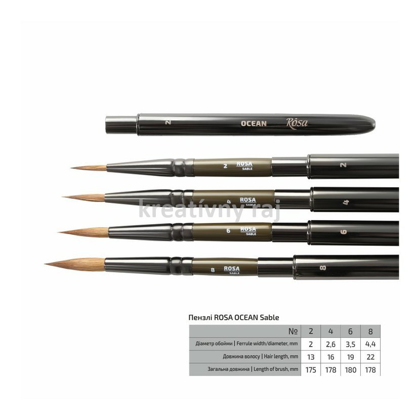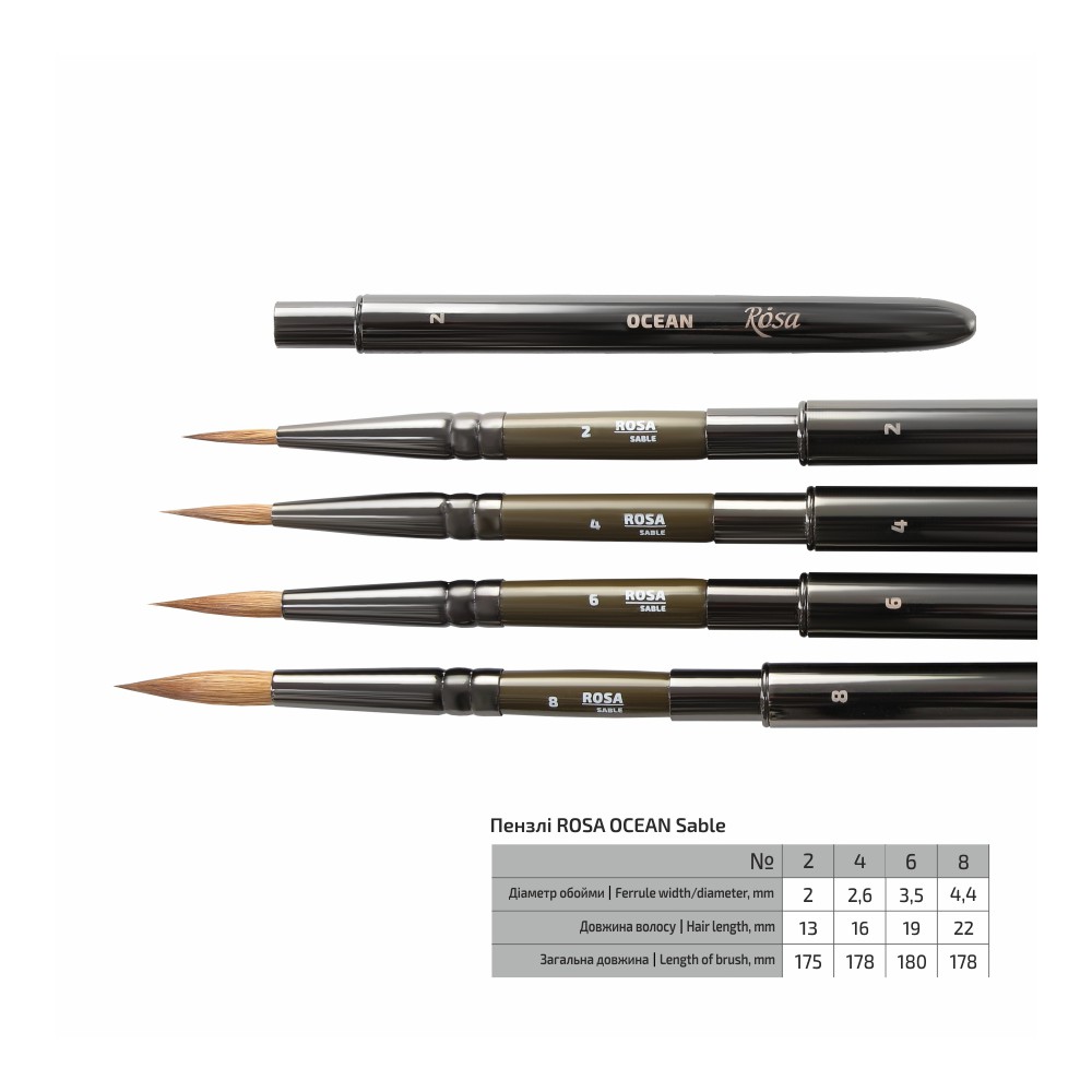 Okrúhle štetce ROSA OCEAN sú vyrobené z prírodných sobolích vlasov a majú špeciálny dizajn TRAVEL BRUSH. Prírodné sobolie vlasy ideálne držia špičku a tvar; dokonale absorbuje a uvoľňuje vodu. Vďaka tvaru a vlastnostiam vlasu sú štetce ROSA OCEAN všestranné pre všetky techniky maľovania akvarelom. Kvalita a vlastnosti štetín zo sobolej srsti sú na rovnakej úrovni ako kolínske sobolie vlasy. CESTOVNÉ ŠTETCE ROSA sú vybavené špeciálnym ochranným viečkom, ktoré chráni vlasy pred mechanickým poškodením počas prepravy: pracovná časť kefy sa dá odpojiť od kovovej rukoväte a schovať do viečka. Vďaka tomu je kompaktný a ľahko sa zmestí do puzdra alebo vrecka. Takéto štetce sú ideálne na vytváranie akvarelovej maľby, náčrtov na cestách a pod holým nebom.