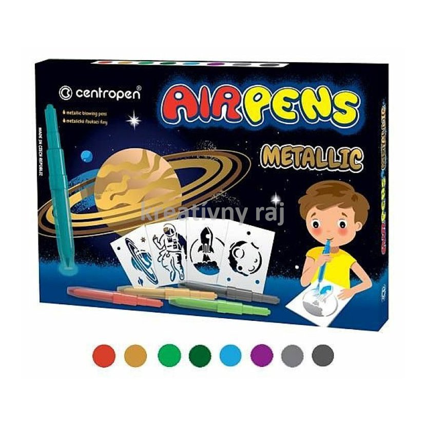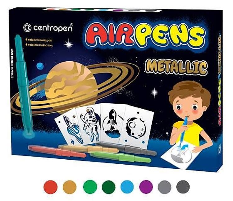 8-kusová sada fúkacích metalických popisovačov, vhodných na papier. Fixy sú plnené zadravotne nezávadným atramentom. Ľahko umývateľné a vyprateľné. Sada obsahuje 8 ks metalických odtieňov, 8 ks šablón a 10 ks špeciálnych čiernych papierov.