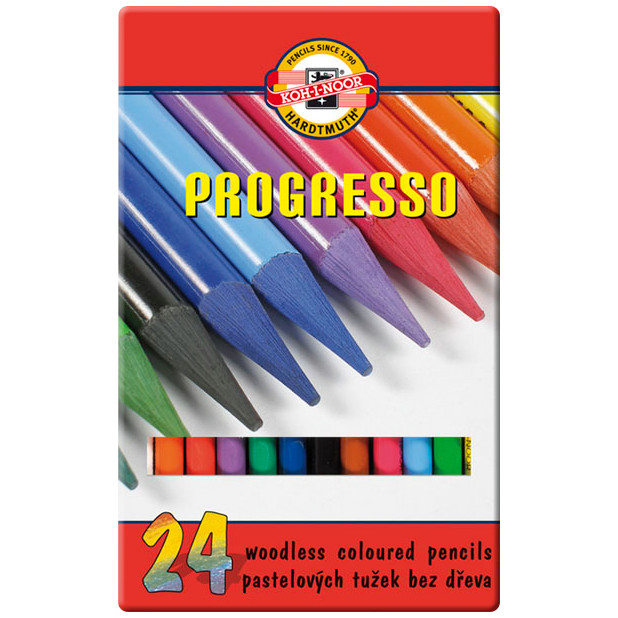 24-kusová sada pasteliek Progres s výbornou krycou schopnosťou, bez dreva, s lakovaným telom. Možnosť ostrenia ceruzky bežným strúhadlom. Vhodné na rôzne druhy kreslenia. Dodávané v papierovom boxe. Dĺžka pastelky 153 mm, piemer 7,6 mm.