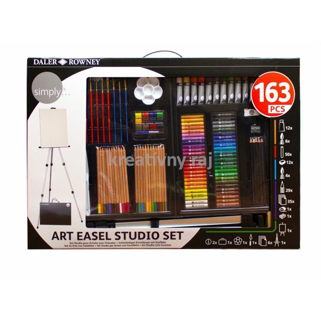 Veľká umelecká sada 163 ks vrátane hliníkového maliarskeho stojanu. Sada obsahuje sortiment pre všetky umelecké techniky - všetko zabalené v čiernej prenosnej taške.