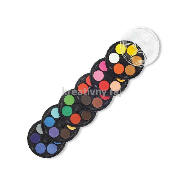 Školské vodové farby Koh-i-noor s priemerom tabliet 22,5 mm s 36 brilantnými odtieňmi vhodné pre špeciálne výtvarné techniky, napr. pre kolorovanie fotografií, maľby portrétov, maľby na dekoračné predmety, zdobenie kraslíc ai. Sú certifikované a úplne bezpečné pre deti .